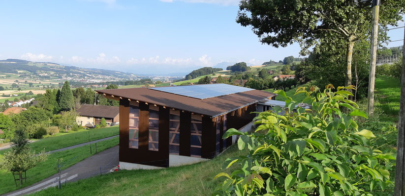 Seit dem Sommer 2021 betreiben wir auf unserem Schopfdach eine Solaranlage. Sie leistet maximal 44 kWp und produziert Strom für das Haus und den Hof.